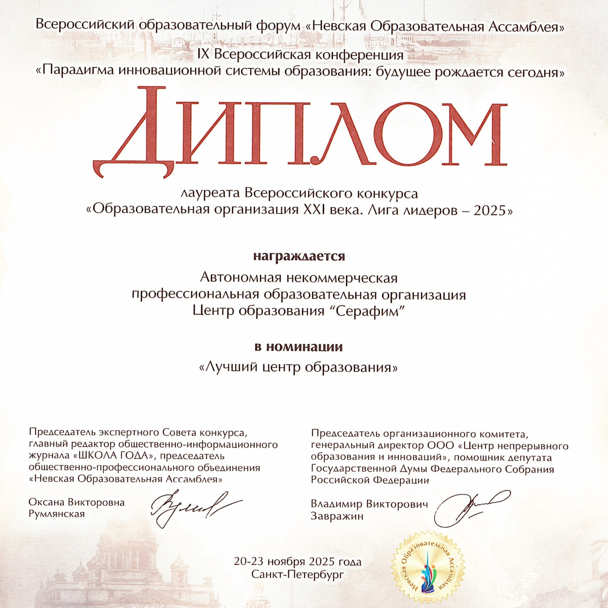Центр образования "СЕРАФИМ" удостоен Дипломом лауреата конкурса "Образовательная организация XXI века. Лига лидеров - 2025" в номинации "Лучший центр образования"